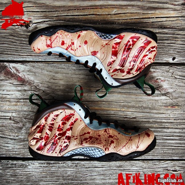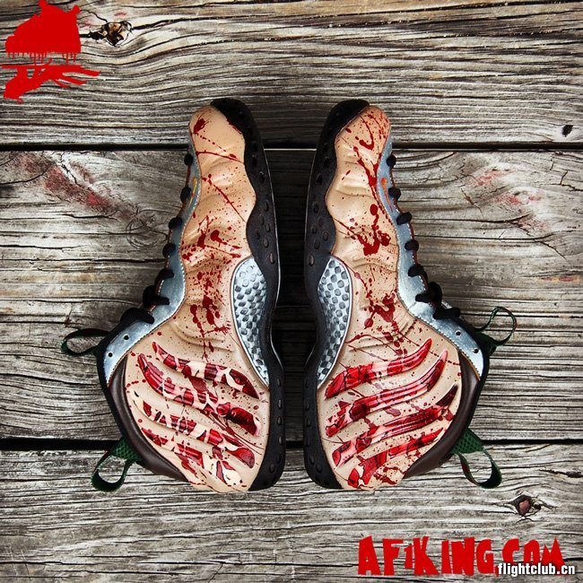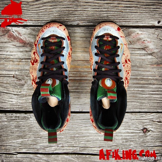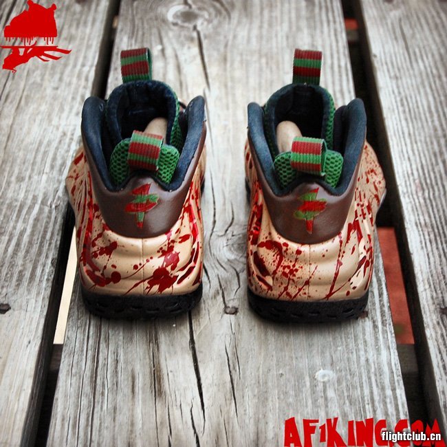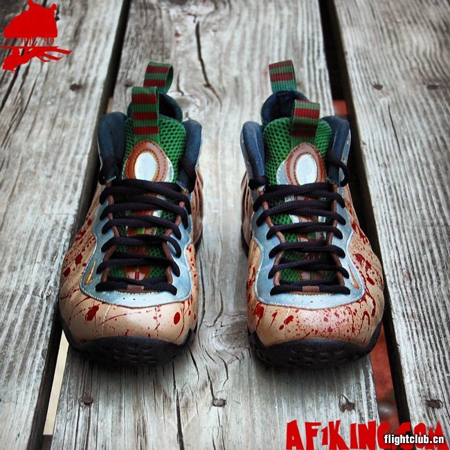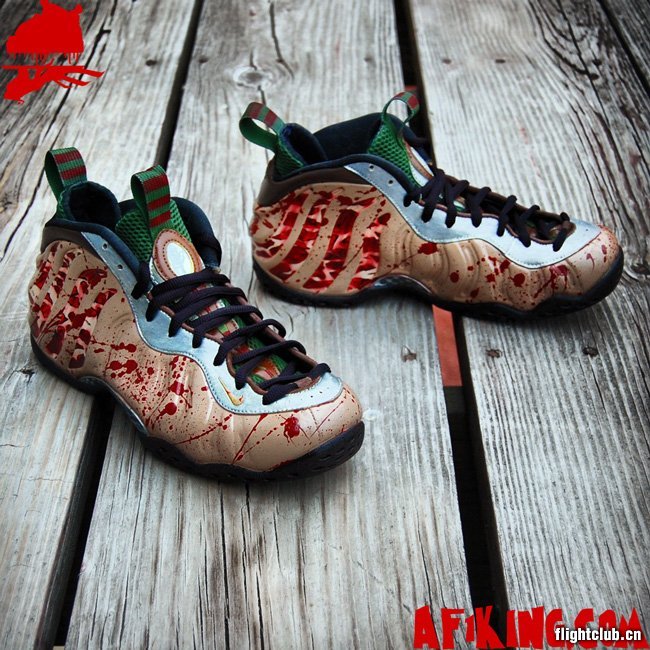 AF1King.com在万圣节期间发布了一双全新的Nike Air Foamposite One 定制鞋款,此鞋以知名恐怖片《猛鬼街》中的主角弗雷德为灵感。血光四溅的鞋面、红绿色相间的鞋舌等细节,让此鞋高度还原了片中那个杀人狂魔的形象。