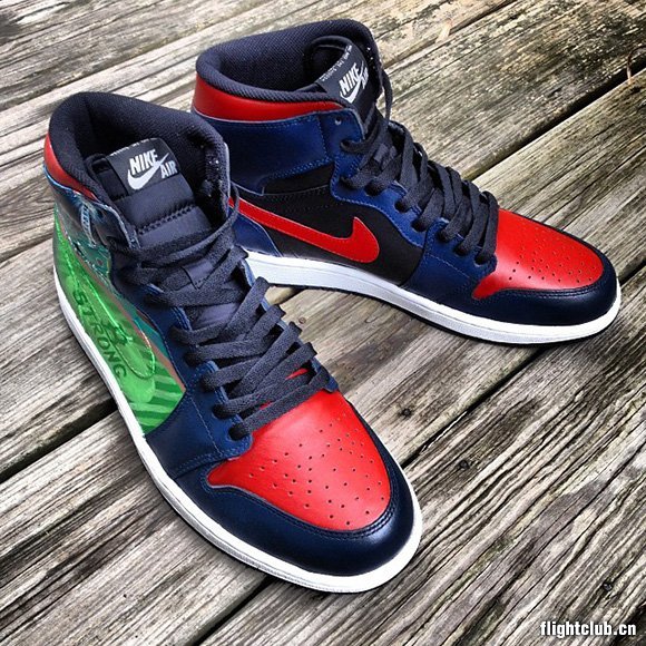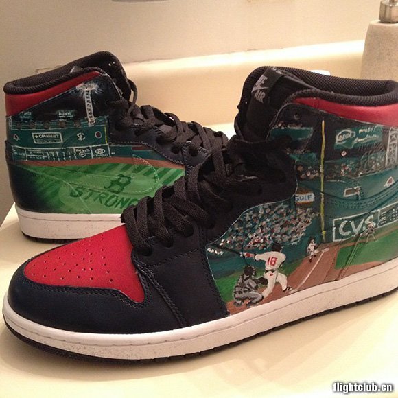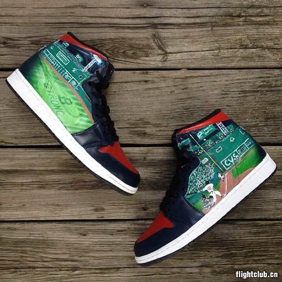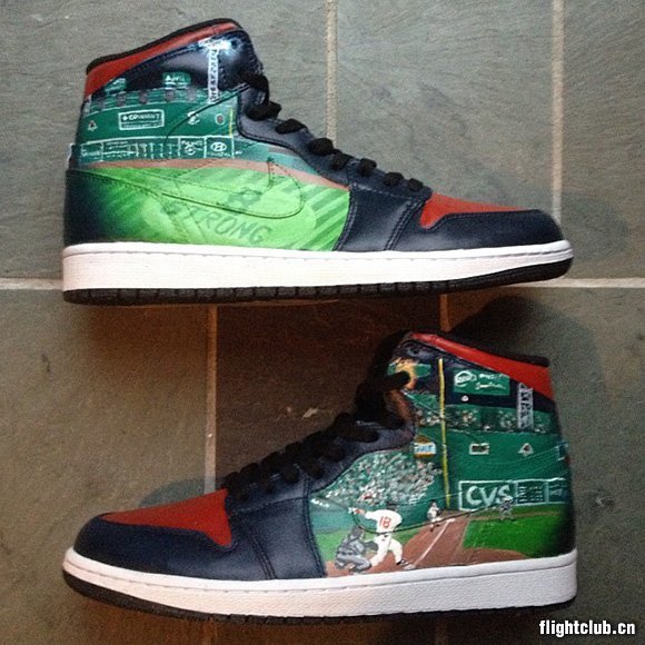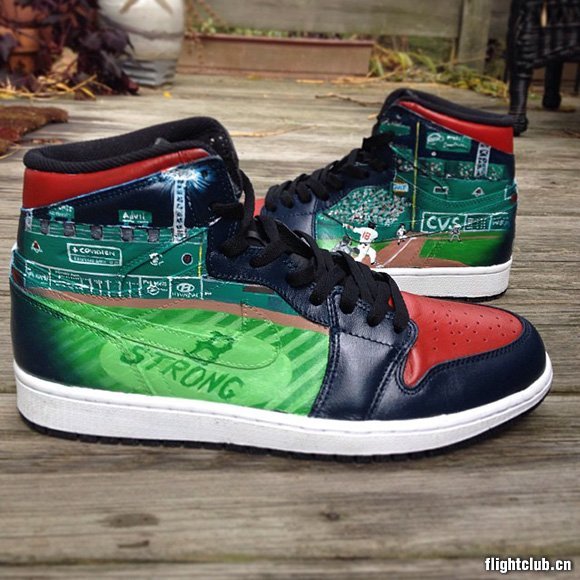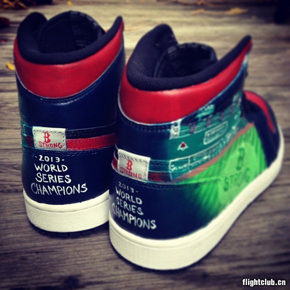 Fuda Customs为纪念波士顿红袜队首次在主场芬威球场夺冠,特地打造了一双Air Jordan 1“Boston Strong” 定制鞋款。黑红的Air Jordan 1鞋身不但涂装成了芬威球场,还在后跟写上了“2013 World Series Championship”的字样。