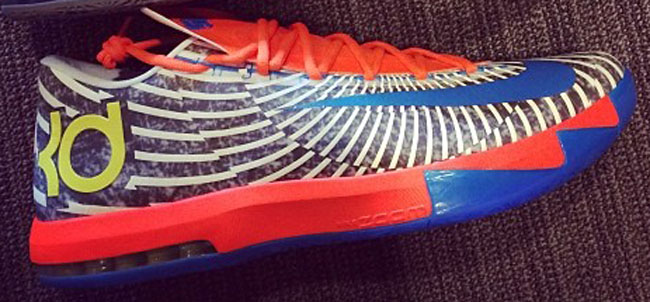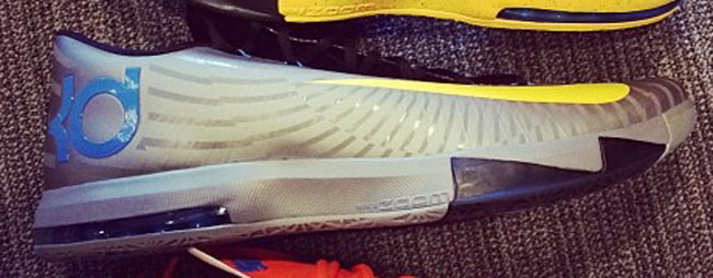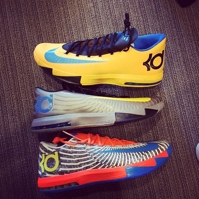 Kevin Durant通过instagram为我们曝光了三双全新配色的Nike KD 6。第一双黄色主色调配上海军蓝色鞋舌/水蓝色swoosh以及泼墨中底;第二双酷似将会发售的“Precision Timing”配色,只是薄荷绿色KD logo变成了蓝色,金色swoosh变成了黄色;最后一双风格与“Pre-Heat”相同,不过配色主题呈现的是雷霆色调。鉴于三双都与市售版近似,所以很有可能是为KD本人打造的独享专属。