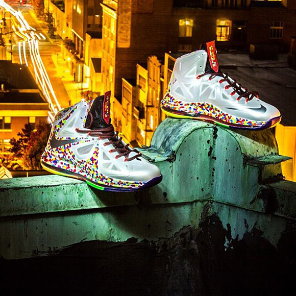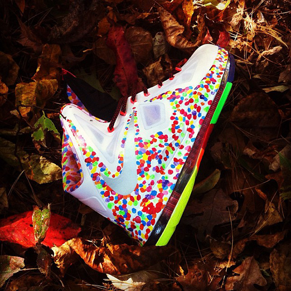 在Zoom LeBron IV时期一款以“水果味谷物早餐”为灵感打造的PE令人难忘,只可惜那个主题以及漂亮的配色再未出现过,也从未以市售形式登陆过店铺货架。不过District Customs以自己的方式将这个主题再现,选用LeBron X做为模板,鞋身以及内衬绘以彩虹色鹅卵石纹,大底画上彩虹色块,即使是一双定制鞋款依旧令人惊艳。