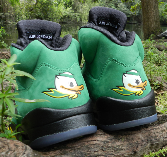绿色牛巴革、鞋舌O刺绣、后跟鸭队标志,俄勒冈鸭队Air Jordan 5 PE无疑是今年最具话题性的Air Jordan 5之一。虽然此双鞋款并不会公开发售,但位于迈阿密的SoleFly店铺却在近日于店中展出了一双。