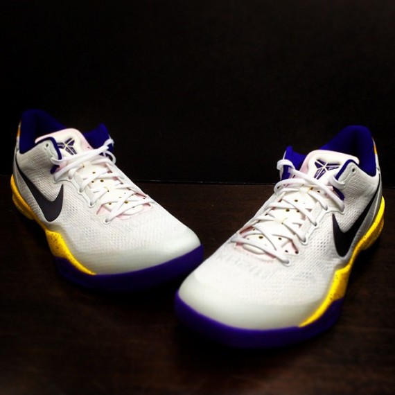 Kobe Bryant的缺席不仅是湖人队的损失,很多为他打造的PE也未能展现在我们面前,就如眼前这双Nike Kobe 8。最简洁的湖人主场配色,白色鞋身配上附有泼墨的黄色中底、紫色内衬/大底以及黑色swoosh,鞋头部分鞋面隐约可见“KB24”。