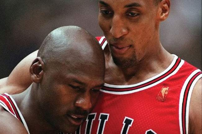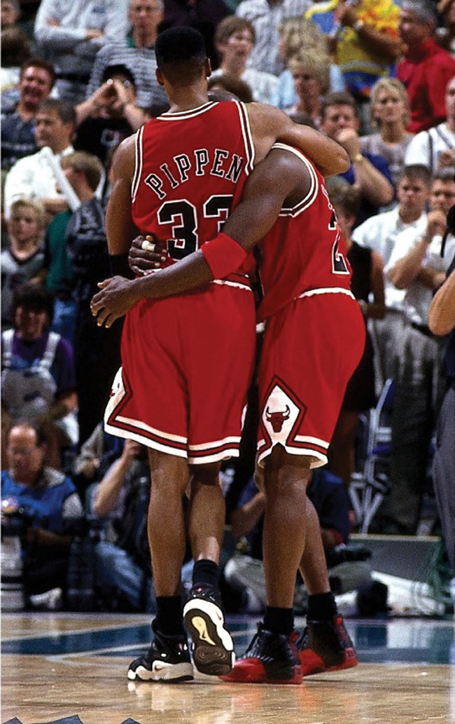 1997 年季后赛乔丹腹泻发烧带病坚持比赛,对阵爵士创造了 38 分的奇迹。在全场比赛结束时乔丹倒在了皮蓬怀里,这幕情景感动了全世界所有球迷。