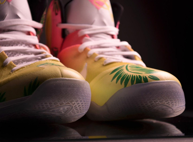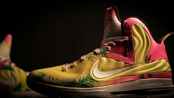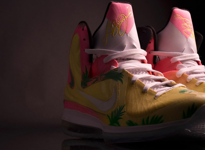 总是佳作不断的球鞋定制团队 DMC Kicks 近日再次发力,推出了一款名为 “LeBronold Palmer” 的 Nike LeBron 9 定制作品。鞋款以黄粉色调为主轴,鞋身上加载了绿色的棕榈叶印花,以此与迈阿密海滩风情相呼应,整体效果相当清新。各位对于这次 DMC Kicks 的新作品打几分?