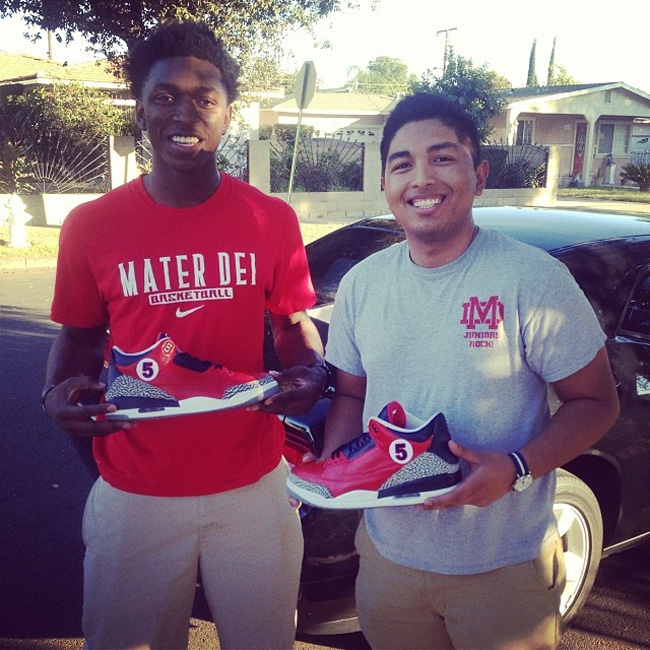 这双 Air Jordan 3 “University of Arizona” 来源于 Sole Clinics 的特别定制,特别为 NCAA 新秀 Stanley Johnson 打造。 在 Air Jordan 3 的经典鞋型上采用了红色的鞋面,黑灰色的爆裂纹任然得到了保留。鞋舌上有亚利桑那大学野猫队的标志,在鞋帮上还有代表 Stanley 的数字 5 号。