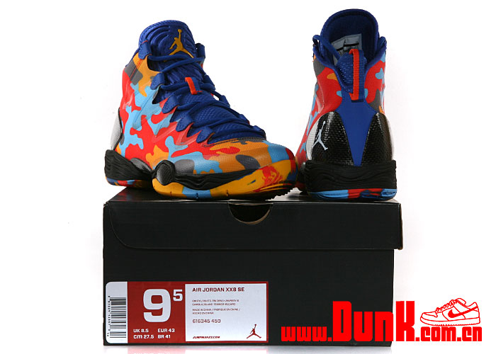 Nike 指定经销商 deal in city 的官网 dunk.com.cn 已经上架了这款明艳抢眼的威斯布鲁克迷彩 Air Jordan XX8 SE,原价销售,¥1399 元。货量不多,请喜欢的朋友抓紧! 购买链接:http://www.dunk.com.cn/showshoes.asp?id=13052 NikeStore 官网会在明天正式发售这款球鞋,发售价 ¥1399 元。