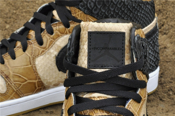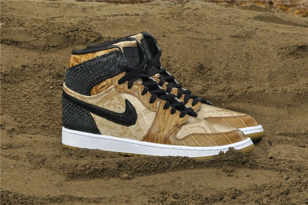 以擅长使用爬行动物元素而闻名的球鞋设计师 JBF 此番带来了一款全新的 Air Jordan 1 “Desert Storm”。鞋面依旧运用他所擅长的物料,将大面积的蟒纹和鳄鱼皮纹理相结合,通过两种鳞片大小的变化、所用材质的变化和颜色的变化三方面体现出沙石地貌的质感。在这个动物纹理泛滥的年代,能将传统的蛇皮和鳄鱼皮纹理搭配的令人眼前一亮实属不易。