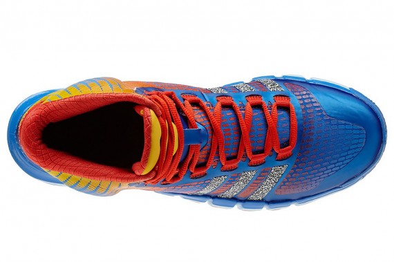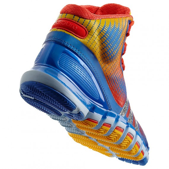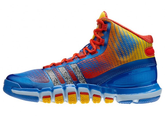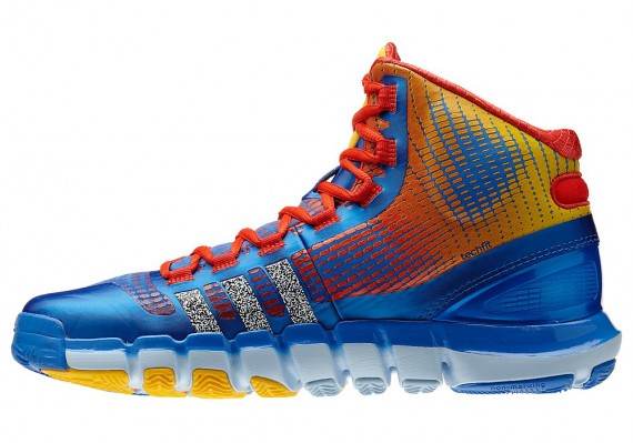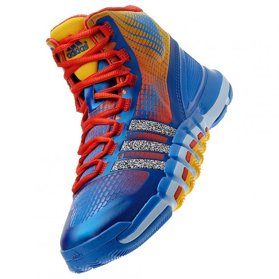 蓝色鞋身搭配橙/黄渐变装饰以及橙红色细节,三条杠以类似信号干扰的黑/白雪花纹理点缀,整个色彩主题与之前曝光的Crazy Light 3以及Real Deal一样,此双Crazy Quick现已正式发售。