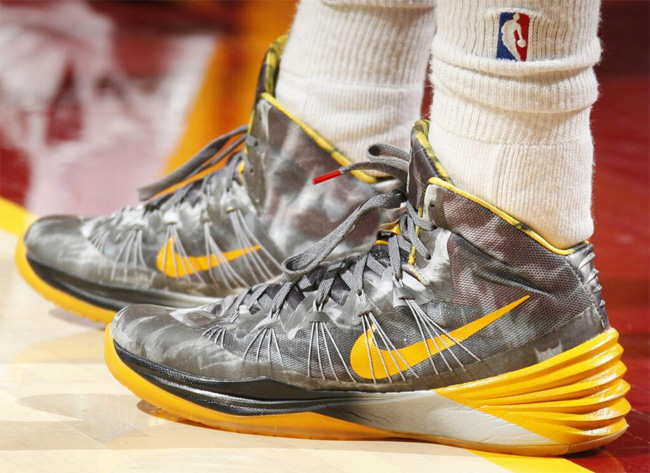 凯里·欧文在今天对阵热火的比赛中继续穿着 Nike Hyperdunk 2013,不过今天上脚的是一款新配色的 PE 球鞋,鞋面采用了灰色迷彩涂装,搭配亮黄色的 Swoosh、内衬和中底。 鞋舌上依然有代表 Kyrie Irving 的大写字母 K。