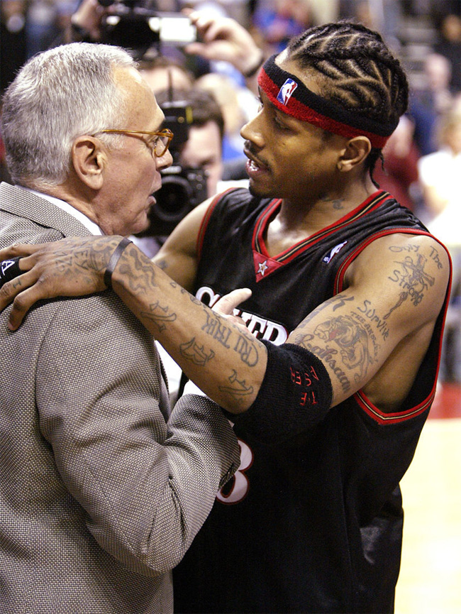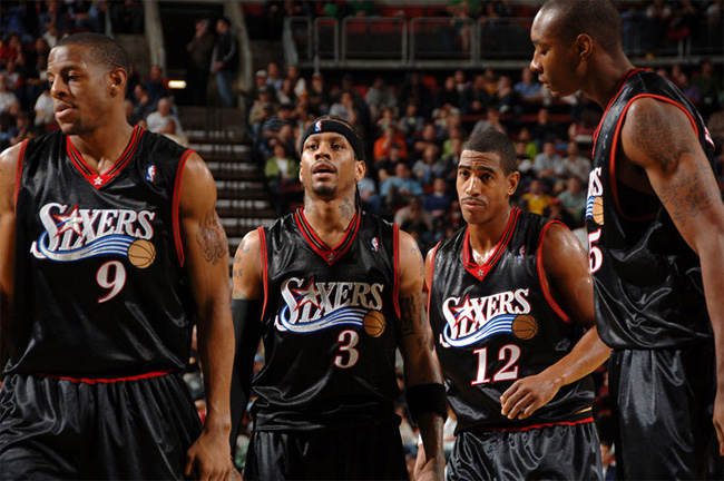 艾弗森是76人队的一面旗帜。作为1996年黄金一代的代表人物之一,艾弗森的NBA职业生涯在76人队起步,他的最辉煌时光也是在76人度过,艾弗森、穆托姆博率队和科比、奥尼尔的湖人队在总决赛大战的经典场面,至今令人难忘。