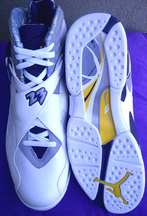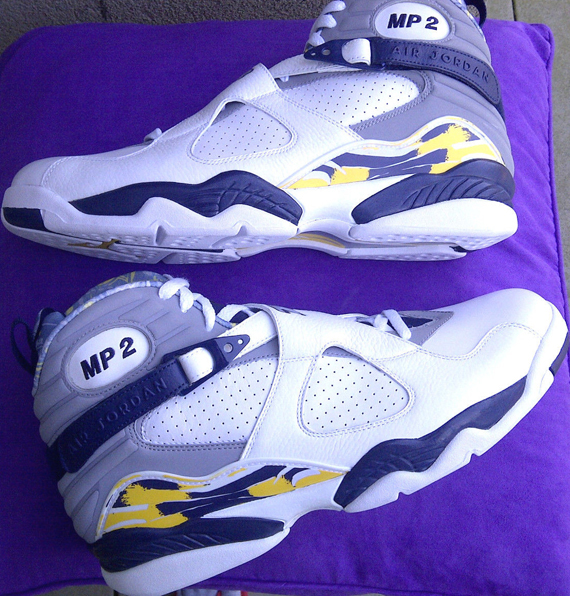 眼前这双Air Jordan 8是为金州勇士队时期的Mickael Pietrus特别打造。白色主旋律配上黄色以及蓝色细节装饰,脚踝处刺绣MP2字样,完完全全的勇士主场风格。此双PE现正在eBay出售中。