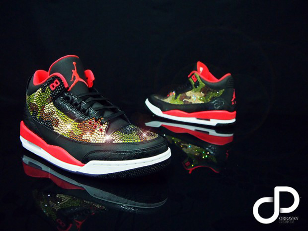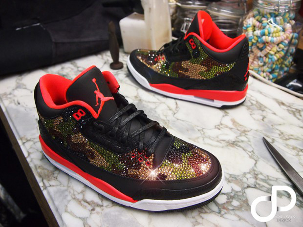 球鞋定制创意愈发广泛,此番球鞋定制爱好者 Orravan Design 将迷彩以及水钻材质两种原本看上去似乎毫无关系的元素相结合,打造出了这款 Air Jordan 3 “Brilliant Camo” 个人定制作品。鞋款鞋身大部分均已水钻覆盖,并显现出迷彩图案。虽然实物效果有待商榷, 但是创意令人感到十分新颖。