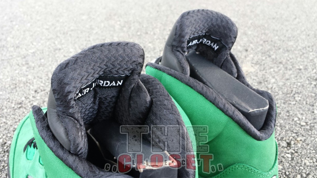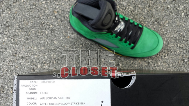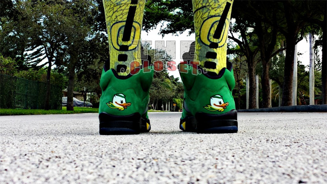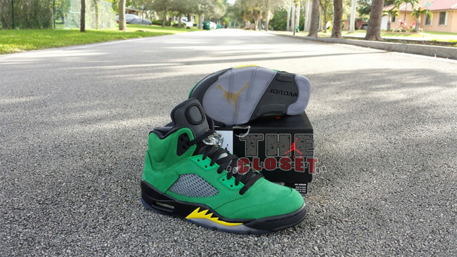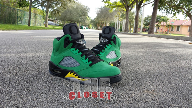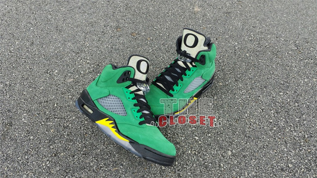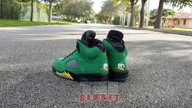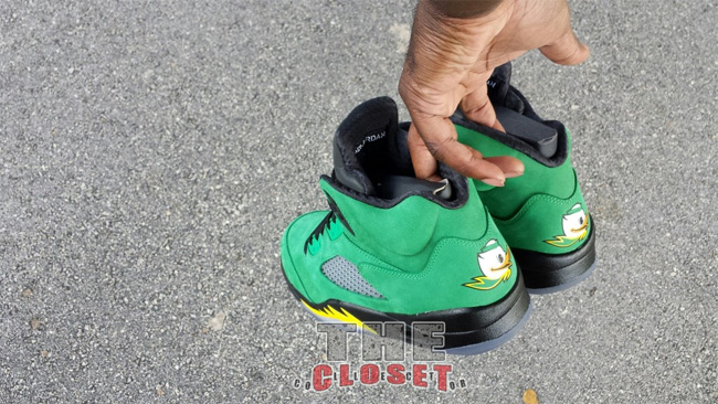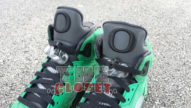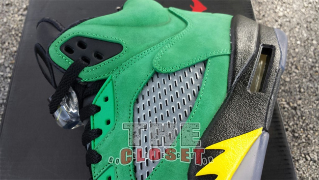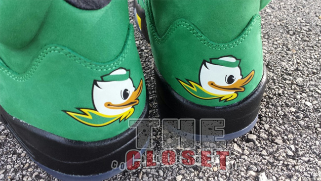 俄勒冈鸭子的加持让这款 Air Jordan 5 "Oregon Ducks" 变得异常迷人。整体采用了绿黑配色,绿色的麂皮鞋面,搭配黑色中底和黄色喷焰图案。后跟有活灵活现的俄勒冈鸭子卡通图案,3M 反光鞋舌上有代表 Oregon 的大写字母 O 。