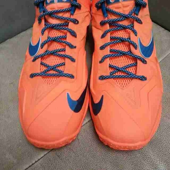 一款橙蓝配色的 Nike LeBron 11 曝光了实物照片。这款球鞋采用了彻头彻尾的橙红色鞋身,发泡材质和 Hyperfuse 部分都是橙色,而大底和鞋舌也采用了同样的颜色,整双鞋在橙色的加持下显得浑然天成。而 Swoosh 和鞋带则应用了蓝色,起到了抢眼的点缀作用。