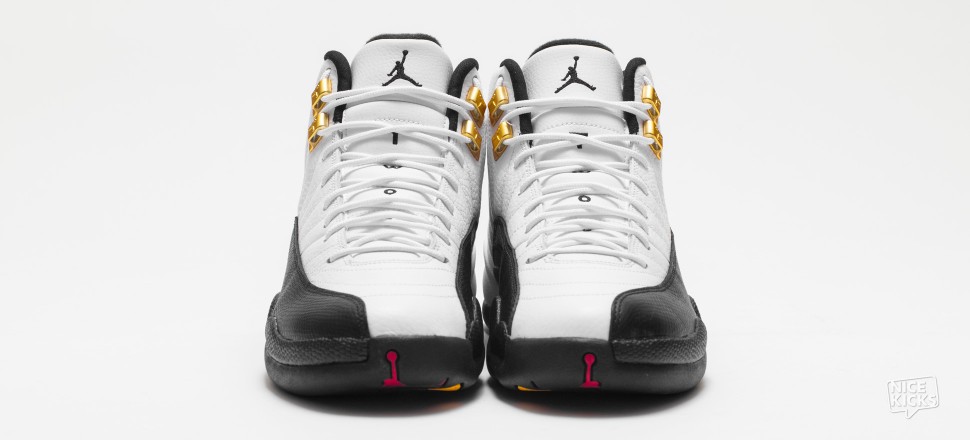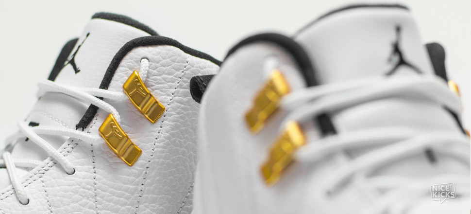 运用了黑白搭配的鞋面设计,将 Air Jordan 12 独特的鞋型完美的展现出来,而金黄色的鞋带扣则是这双球鞋最抢眼的点缀。
