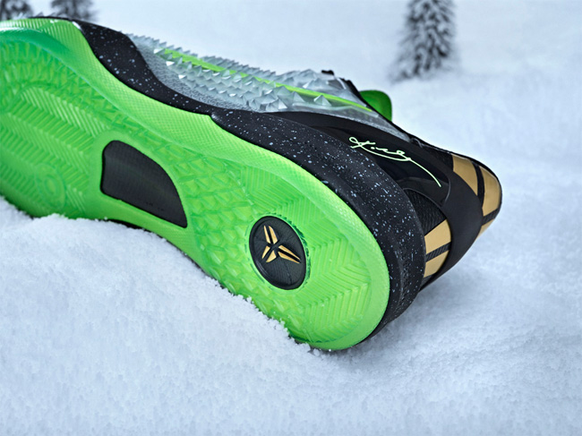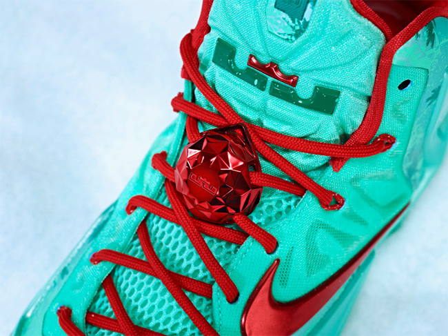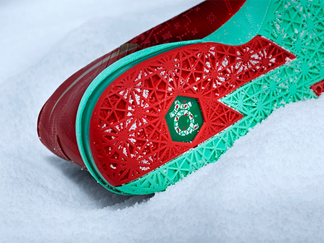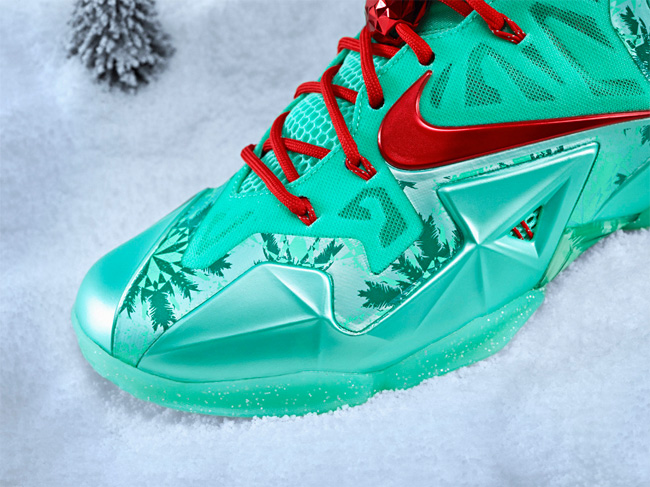 LeBron 11 Christmas 采用了绿色的鞋面,点缀红色的元素,鞋面上还带有雪花和圣诞树图案,节日氛围浓厚,货号为 616175-301。