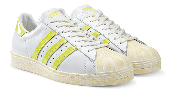 adidas Originals Superstar 80s 以其经典的线条以及享誉全球的贝壳头设计在长久以来一直保持着经久不衰的魅力,对于即将到来的2014年,adidas Originals 也为 Superstar 80s 准备了三款极为清爽的配色。每款配色均以白色皮革构成鞋身主体,三款鞋的三杠标志以及后跟分别以黑色、嫩粉色以及明黄色呈现,再配以做旧处理的贝壳头以及硫化大底,给人一种摩登与复古交相辉映的感觉。