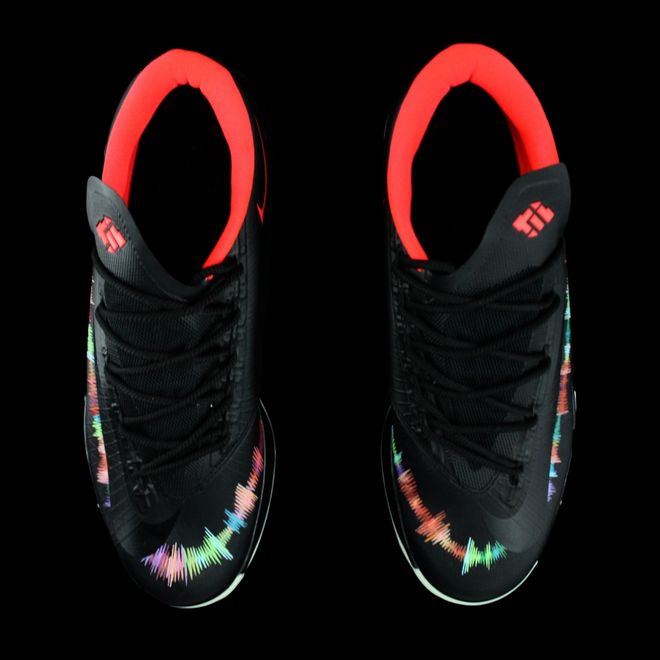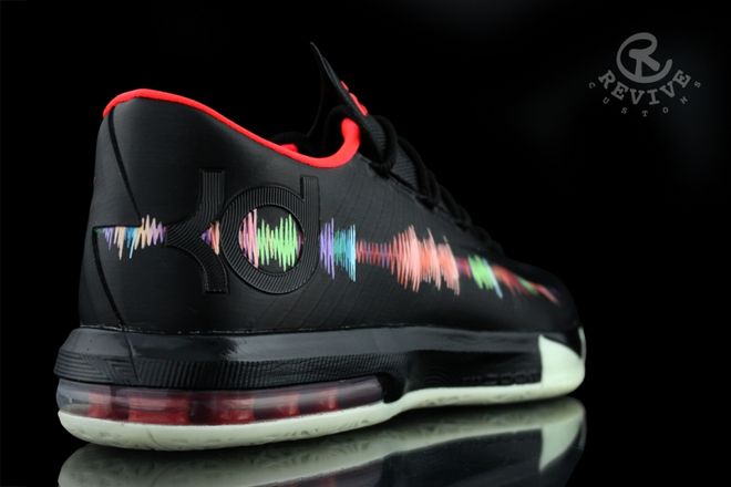 近日这双出自Revive Customs的定制新作Nike KD 6 “Serato” 出现在网络上。冷酷的黑色鞋面搭配耀眼的红色内衬,极具视觉冲击力。名为“Serato” 充斥于鞋身用色彩将音浪演绎于这双Nike KD 6之上,色彩的变化,高低起伏宛如一曲美妙的音乐环绕鞋身,动感十足。