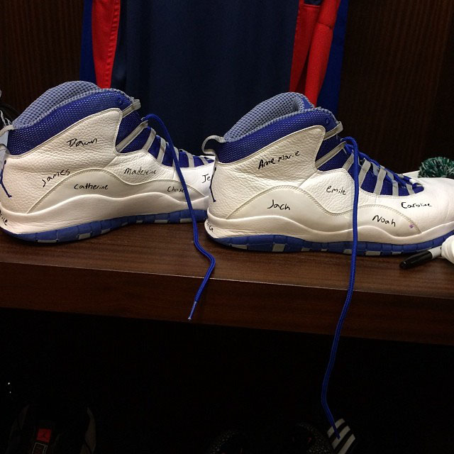 桑迪胡克小学枪击案一周年,底特律活塞队中锋Andre Drummond在自己的比赛用鞋Air Jordan 10上写下了遇难者的名字以示敬意。除了球鞋上的26个名字之外,Drummond也会将自己的球衣捐赠学校。