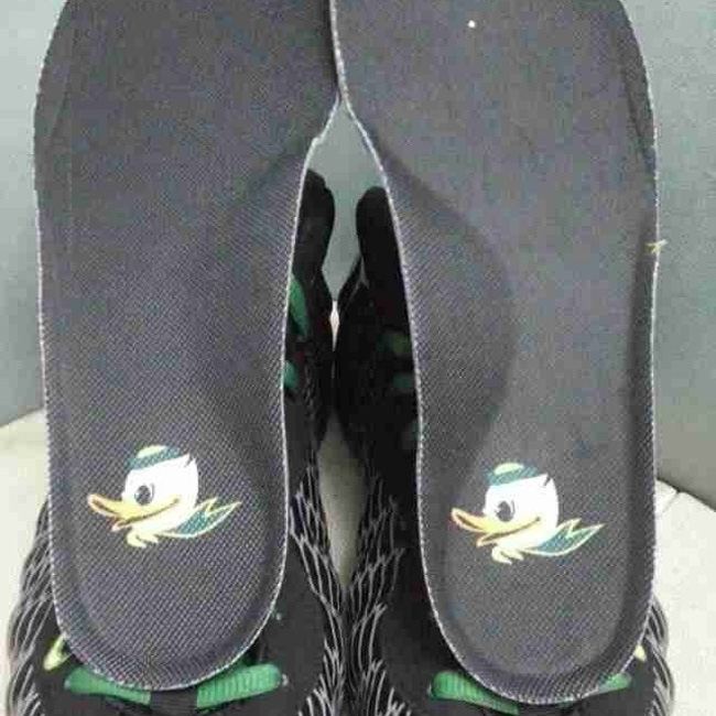 整体采用了经典的俄勒冈黑绿配色,发泡材质的鞋面上布满了鸭子羽毛般的图纹,鞋后跟和鞋提上都有俄勒冈的 LOGO 和文字,鞋舌和鞋垫上都有俄勒冈鸭子的卡通图案,雪花水晶大底也异常抢眼。