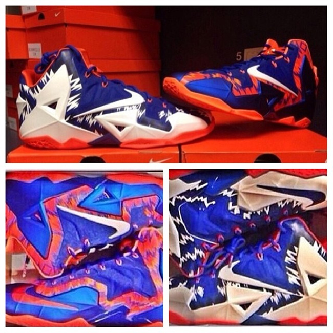 活跃于赛场的LeBron 11鞋款可不只限于LeBron James脚上的,网上曝光为佛罗里达大学短吻鳄队的球员们专属打造的主客场双色LeBron 11 PE。鞋款以球队的蓝、白、橙色搭配设计,鞋身最为出挑的无疑是折线迷彩纹理的装饰。