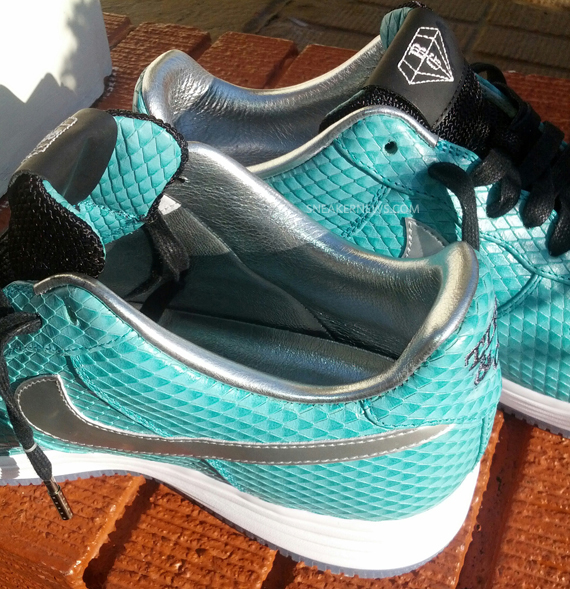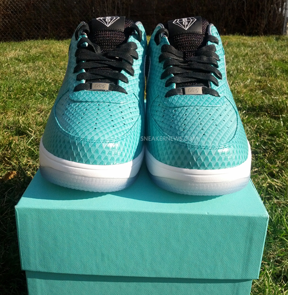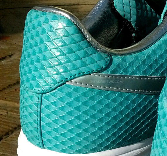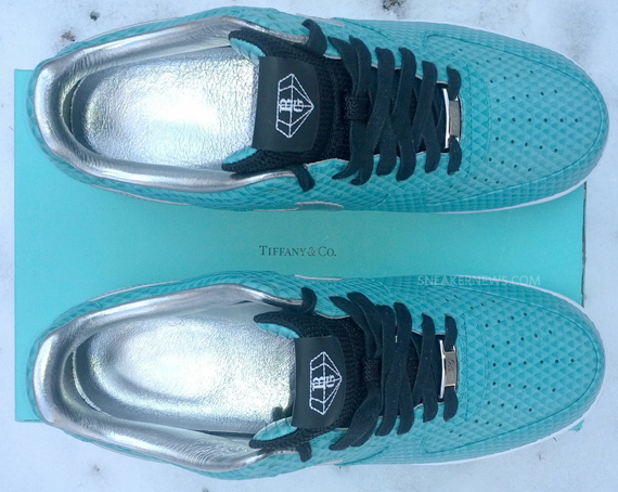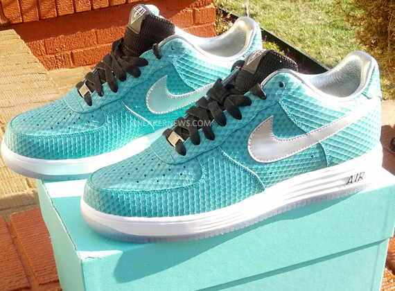 这款由 Anthony Baker 购买定制的Nike Lunar Force 1 Bespoke “Tiffany” ,采用薄荷绿蛇皮打造鞋身,搭配上白银 Lunar 中底,点缀银色 Swosh,整体效果十分抢眼。