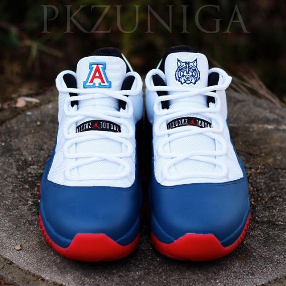 球鞋定制专家 pkzuniga 近日为亚利桑那野猫队专门打造了一双 Air Jordan 11 Low “Arizona Wildcats” 个人定制鞋款。pkzuniga 在设计之中汲取了夜猫队标志性的红蓝色为主色调,辅以白色的网面鞋身,左右脚的鞋舌上分别出现了亚利桑那野猫队的校徽以及球队 Logo。