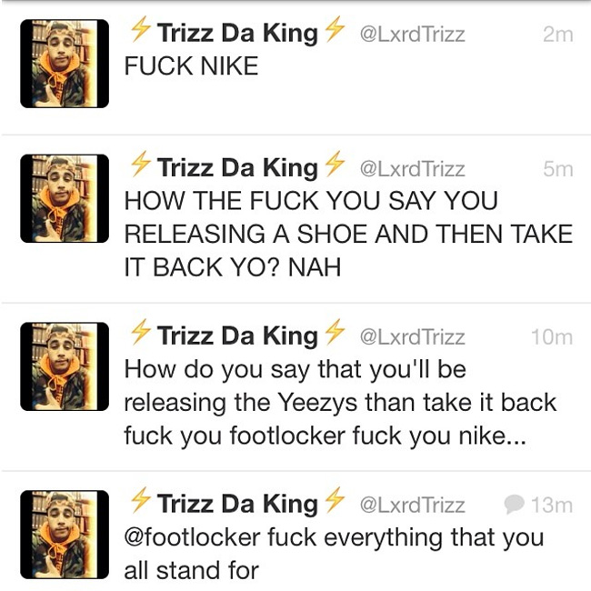 Foot Locker 之前在 Twitter 上确认了 27 日的线上发售,现在又食言取消,不知这中间发生了怎样的变故。是 Nike 方面对于这双鞋的发售做了新的利弊权衡,觉得发售的弊大于利,还是来源于外部的压力导致 Nike 叫停,我们不得而知。粉丝们按捺不住愤怒的心情,对 Nike 和 Foot Locker 发起了言语上的攻击。