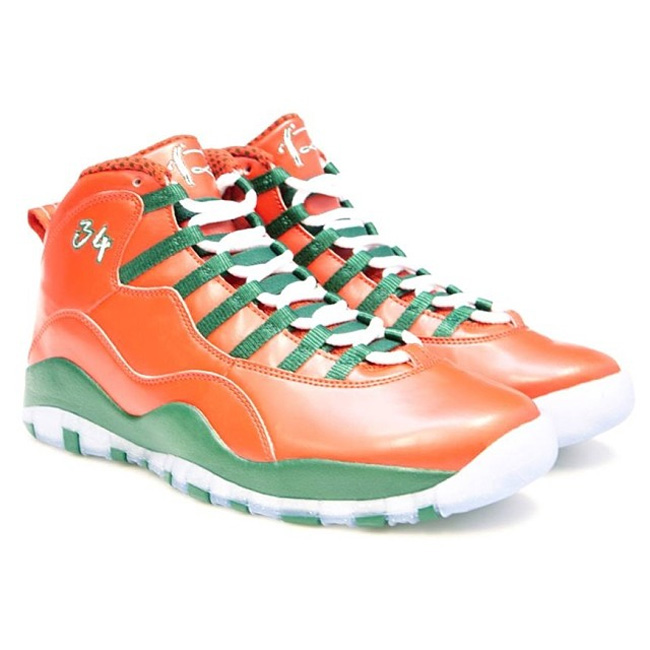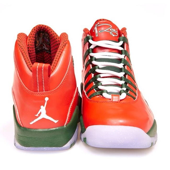 雷阿伦在今天圣诞大战对阵湖人队的比赛中穿着了这款红绿搭配的 Air Jordan 10 Ray Allen PE "Christmas"圣诞配色。 红色的鞋面再点缀绿色的细节,圣诞节日氛围浓厚。鞋舌上不仅有雷阿伦的签名,还有他经典的投球形象刺绣,彰显了联盟顶级投手的身份。 这和之前曝光的另外一款绿色鞋面的 Air Jordan 10 Ray Allen PE 圣诞配色的色彩搭配刚刚相反。 相关信息: Air Jordan 10 雷阿伦圣诞PE 实物曝光