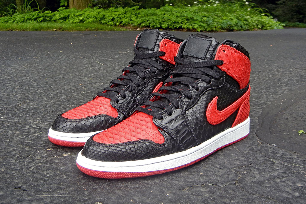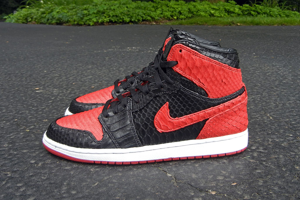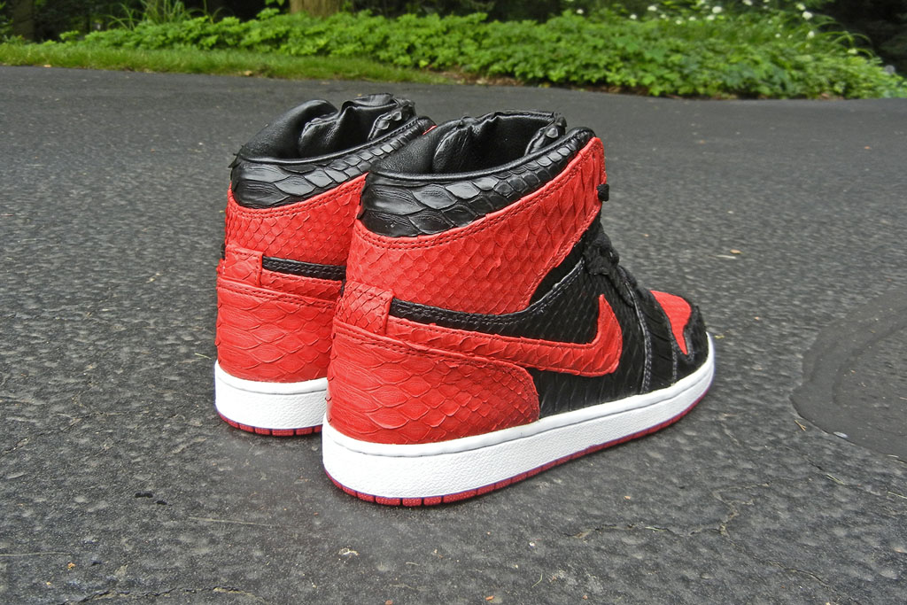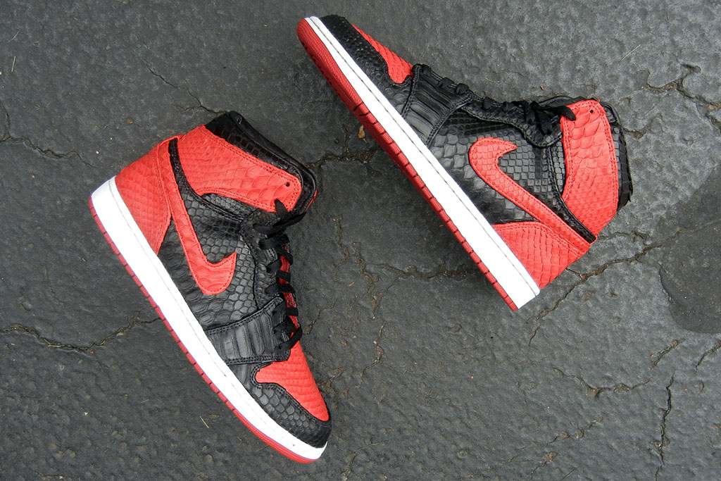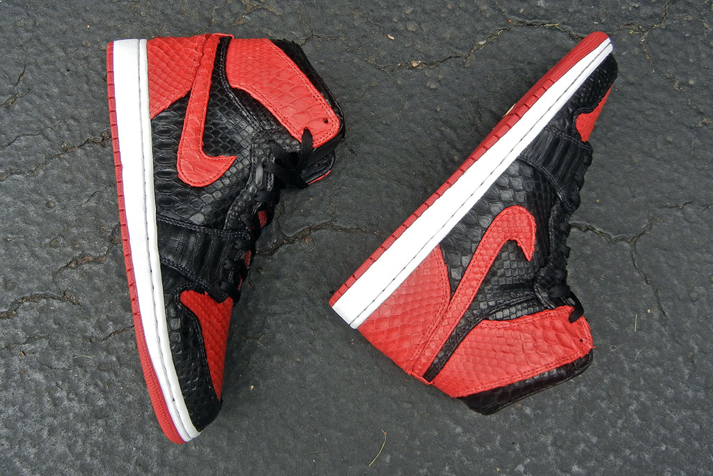 JBF Customs极合适宜的推出了定制鞋款“黑红巨蟒”Air Jordan 1。擅长更换鞋身材质的JBF Customs将黑红色Air Jordan 1的皮质鞋身全部更换为带有蛇纹鳞片的皮质,色块搭配依旧但整体质感提升不少。共有五双在JBFcustoms.com出售。