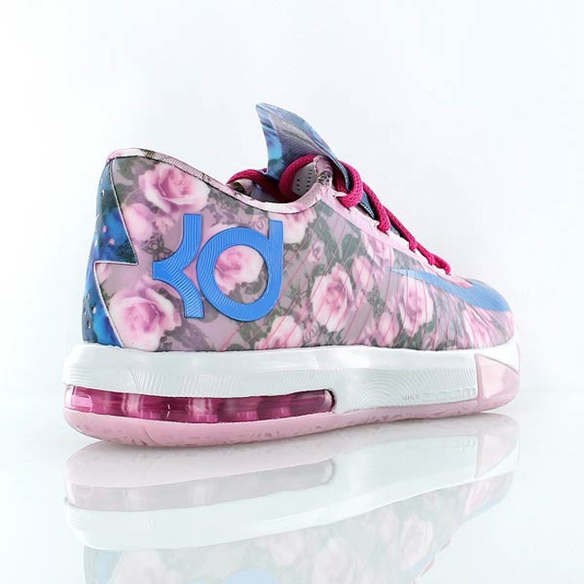 KD 系列的必备配色,为了纪念杜兰特因乳腺癌去世的阿姨 Aunt Pearl。这次在 KD6 鞋身上的呈现格外特别,并没有采用粉色作为主色调,鞋身的内侧和外侧都布满了蔷薇花图案。