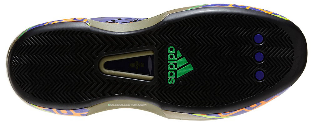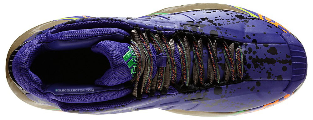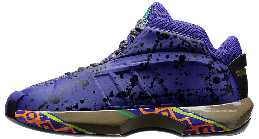 2001年全明星赛时Kobe Bryant亲着日光黄adidas Kobe亮相,13年后此鞋款以全新名字重返全明星周末。此双adidas Crazy 1以紫色鞋身搭配暗军绿色中底,泼墨细节附于鞋带以及鞋身,中底辅以艳色图腾装饰,将于下个月正式发售。