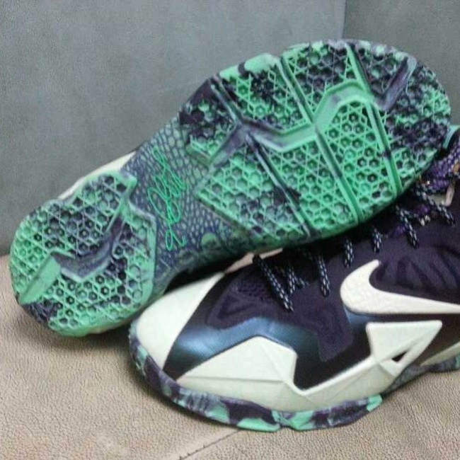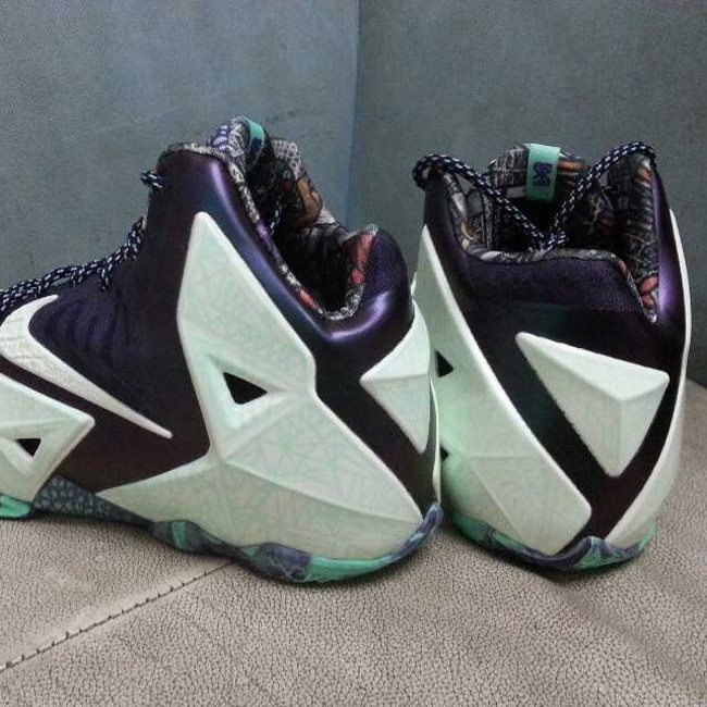 詹姆斯第 11 代战靴的全明星配色现在有了更多的实物图片。 这款 LeBron 11 ASG 采用了白色的发泡材质搭配深蓝色的 Hyperfuse 材料构成鞋身,发泡材料上有不规则的纹路,并且带有夜光效果。大底、鞋舌和内衬则采用了斑驳的图案点缀。