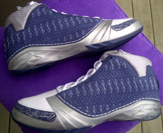 眼前这双特别的Air Jordan XX3是为小牛队时期的Josh Howard特别制作,海军蓝色鞋面附有XX3的独特刺绣纹理,银灰色中底以及内衬为鞋款增色不少,左脚鞋舌还绣有Josh Howard的背号。