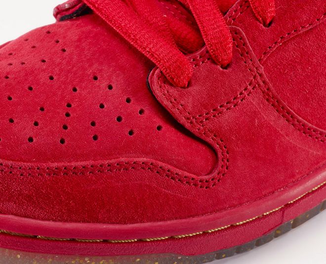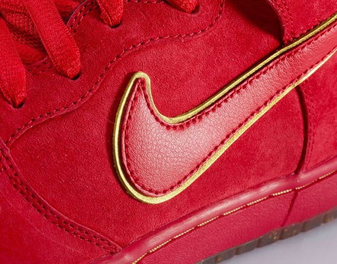 在2014年农历新春临近之际,NIKE SB推出以新春红包为灵感的NIKE DUNK HIGH PREMIUM SB。鞋款整体为红金配色,洋溢着红红火火的欢乐气氛,NIKE SB也希望藉此与广大滑板爱好者和鞋迷们一同庆贺农历新年。NIKE DUNK HIGH PREMIUM SB鞋身采用麂皮和皮革双重材质,鞋头、鞋侧和踝部大面积使用优质麂皮,保证了滑板时的舒适和灵活,同时兼具耐用性。高帮的鞋领处采用皮革,确保鞋型挺括之余更可提供额外保护,双层皮革的SWOOSH和隐蔽式的前端穿鞋孔设计加强了滑板鞋高损耗区域的耐磨性。后跟的ZOOM AIR缓震气垫能提供滑手落地时保护,外底在脚掌和后跟处的改良版凹槽设计使其更具摩擦力,并提供出色的触板感。