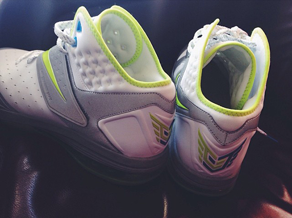 因为绰号“威震天”的缘故,Calvin Johnson的个人标志看起来颇有变形金刚的风格,而个人鞋款也因此充满机械感。眼前这双CJ81 Trainer Max则是一款未市售样品,鞋身以白色搭配反光银色,细节点缀蓝色以及荧光色。