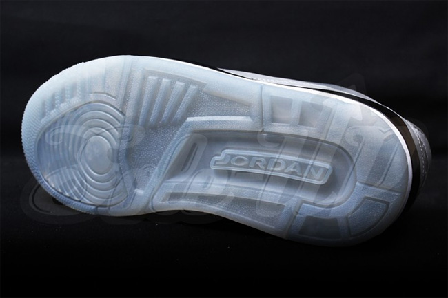 而鞋底则使用了 Air Jordan 5 上常见的水晶大底,并且从鞋头处的鞋底包裹方式上来看,造型上和 5 代保持一致,和传统的 3 代鞋底的结合方式不同,鞋底的花纹还是保留了 3 代的传统图案。