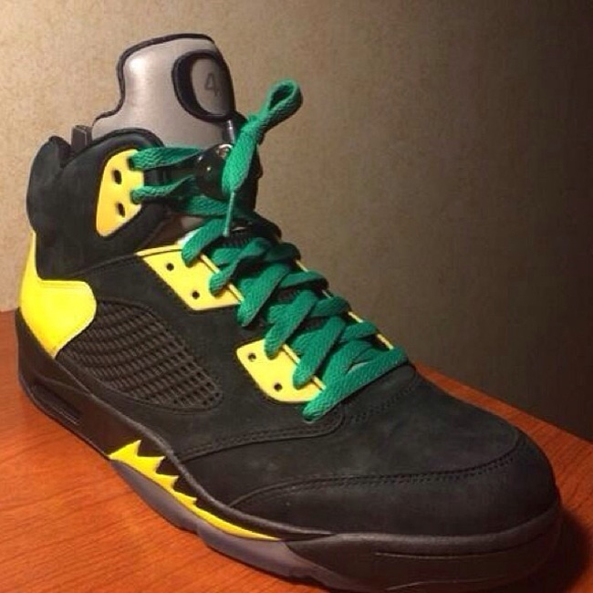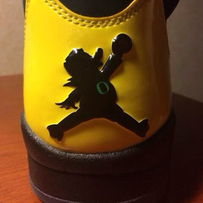看惯了绿色鞋身的 Air Jordan 5 "Oregon Ducks" PE,这款黑色鞋面的 Air Jordan 5 "Oregon Duckman" PE 是否让人眼前一亮? 这款俄勒冈配色的 Air Jordan 5 采用了黑色的翻毛鞋面,搭配黑色中底,细节采用黄色点缀,3M 反光鞋舌上仍然带有显眼的 O 字,同时标有球员的球衣背号。而后跟的唐老鸭形象 LOGO 模仿了飞人的 Jumpman 动作。 这款特殊的球鞋是俄勒冈球员专属,在鞋舌内侧还印有个人姓名。