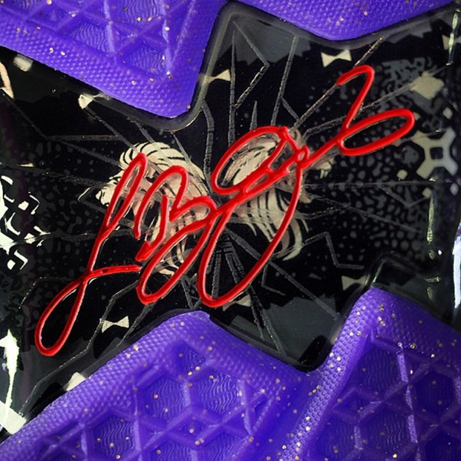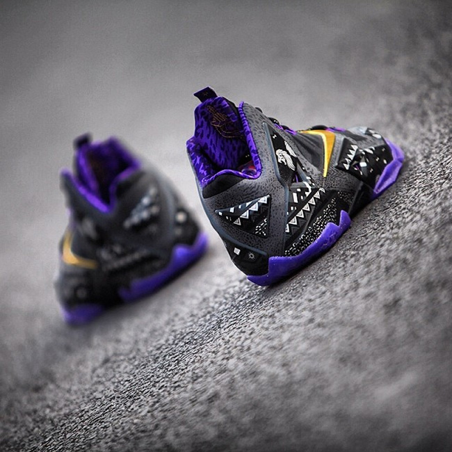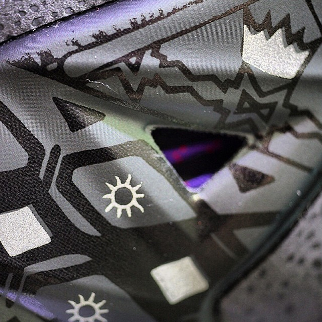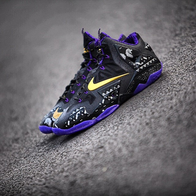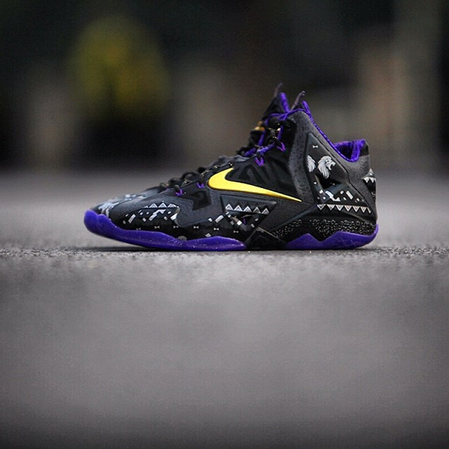 黑人月配色的 LeBron 11 BHM 在视觉上颇具冲击力,除了黑灰紫色调的完美搭配,黑人月图纹和发泡材质的结合也十分抢眼。然而在弱光环境中,这些带有 3M 反光材质的名族风格图纹会反射出抢眼的光芒。 via instagram.com/gc911