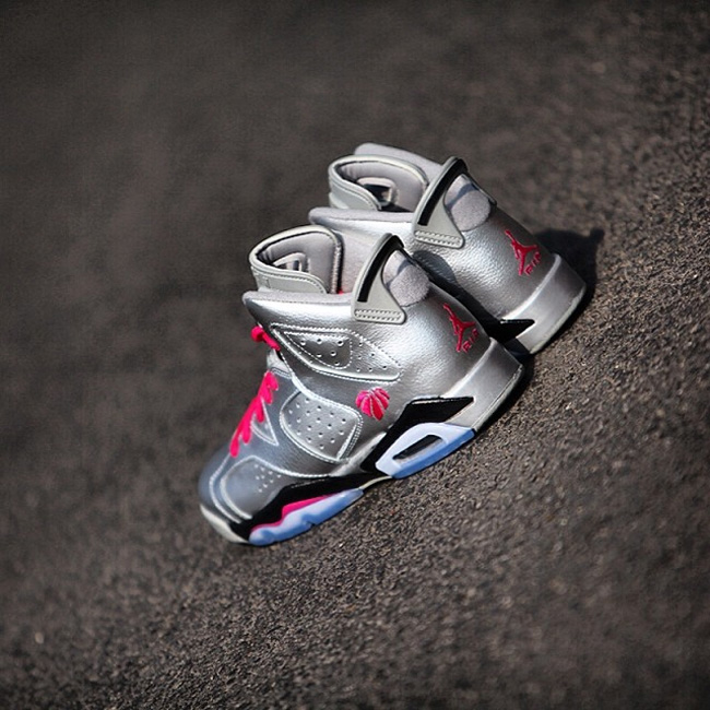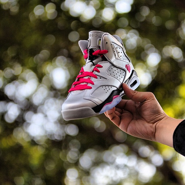这双 2014 款的情人节配色 Air Jordan 6 GS 早在去年年中就已曝光,现在有了更加清晰的实物照片。 银色的鞋面点缀粉红色细节,整体效果十分抢眼,而鞋帮上的情人节 LOGO 则表明了它专门为了 2 月 14 日打造。 via instagram.com/gc911