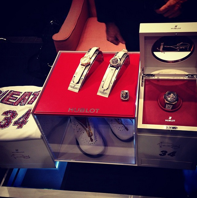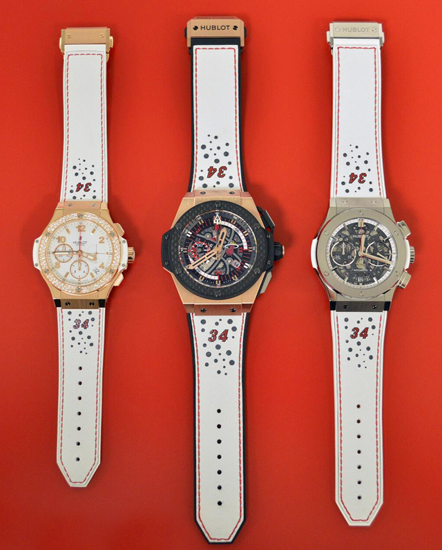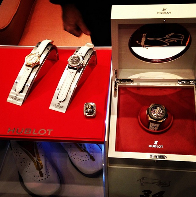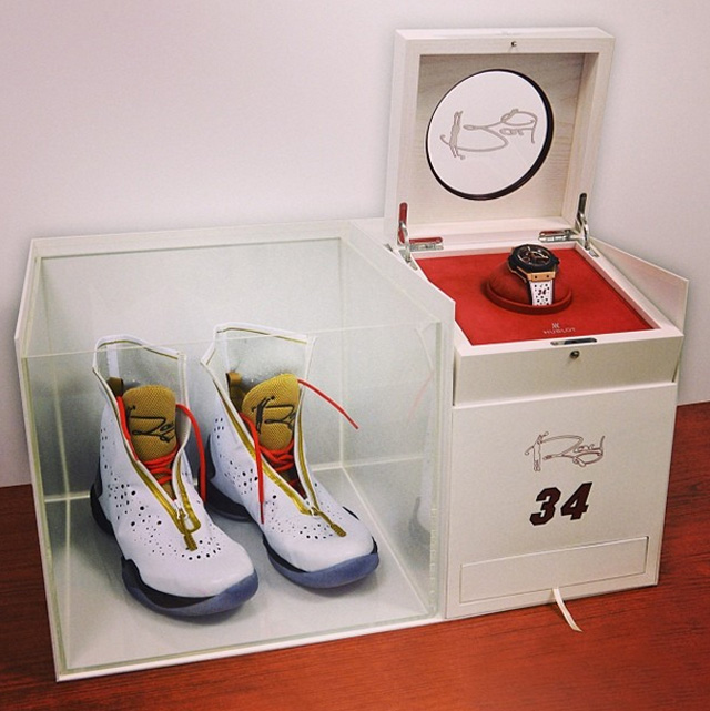近日瑞士制表商Hublot与Ray Allen联手提供Air Jordan XX8+恒宝表的组合为糖尿病研究提供拍卖物品以筹集善款,这次合作的一个原因就是Ray七岁的儿子Walker在17个月大时被诊断出1型糖尿病。组合中除了有Ray在2013年NBA总决赛第六场亲穿的白色Air Jordan XX8 PE之外,还包括表带灵感源于XX8 PE鞋款的恒宝手表。此次拍卖将于1月27日在迈阿密海滩的拉各斯乡村俱乐部进行。