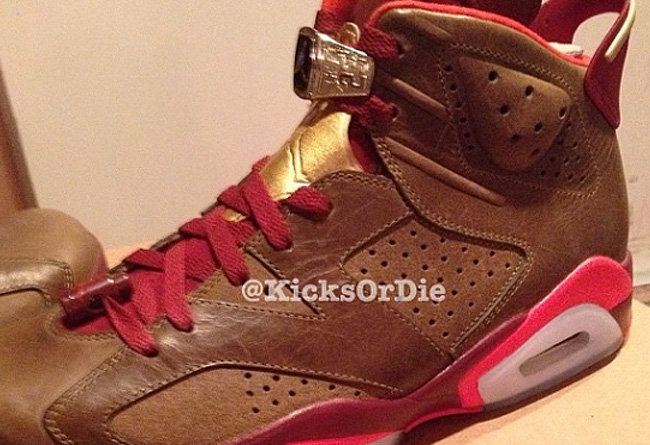 着用Air Jordan 6时Michael Jordan拿下了第一个总冠军荣誉,但除了DMP套装之外并没有别的鞋款以此为主题呈现。不过近日网上提前曝光的一款Air Jordan 6看似弥补了这一遗憾。棕色皮革鞋身表现出雪茄感,配以象征荣耀的金色并点缀红色细节,鞋带固定扣则改成了戒指设计,与“冠军雪茄”的主题颇为契合。此款货号384664-250,初定今年夏季发售。