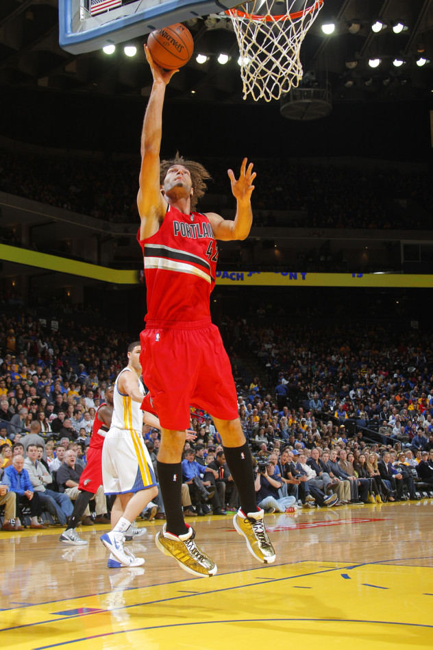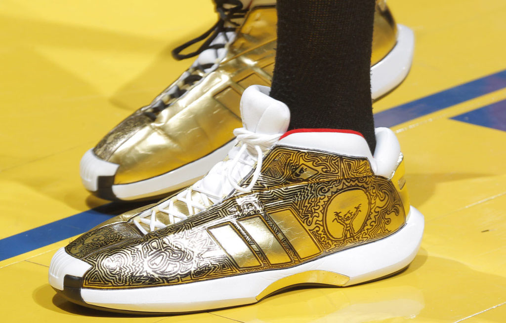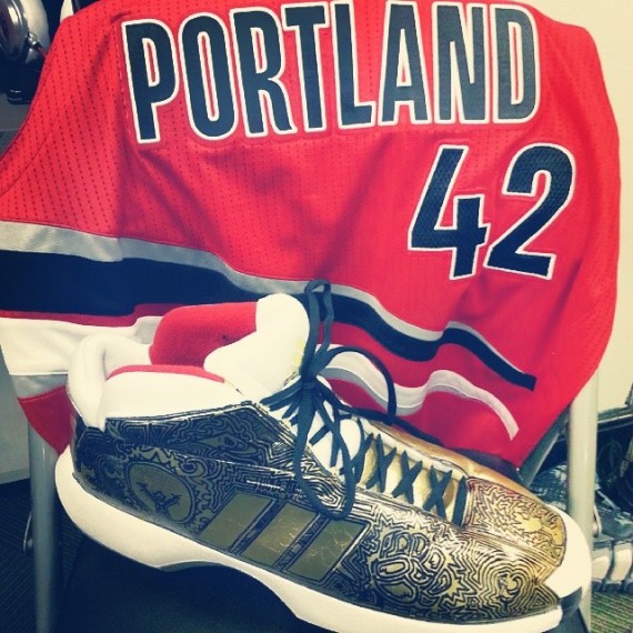 在昨日对阵勇士的比赛中,开拓者队的Robin Lopez穿上了一双极为别致的adidas Crazy 1 “Fists of Midas” 定制鞋款。此鞋由adidas Crazy 1“Awards Season”打造而成,金色鞋面上布满了黑色涂鸦装饰,配以白色中底极为亮眼。(图片来源网络)