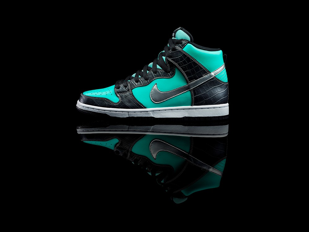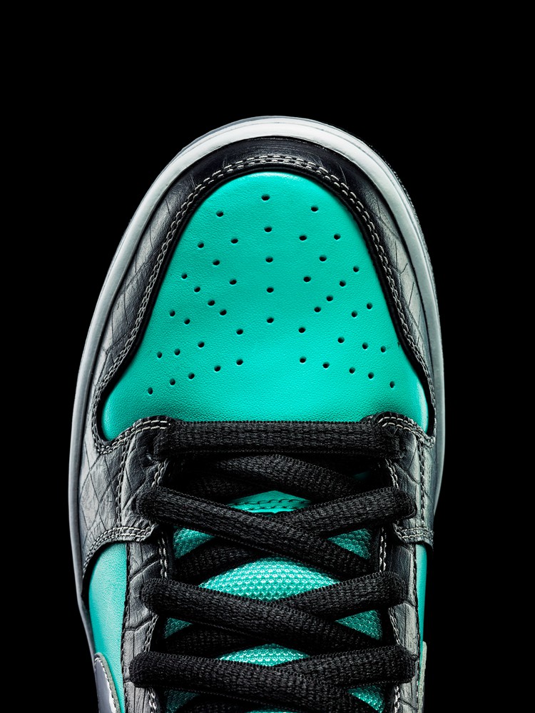 此次Nike SB延续原款的设计元素,推出高帮款式。Nike SB Diamond Dunk Hi鞋身采用经典的水蓝色皮革搭配黑色鳄鱼皮花纹材质,并辅以极具标志性的银色Swoosh,整体干净简洁,清爽悦目,质感十足。鞋舌上印有Nike SB标志和Diamond Supply Co.的钻石图案,非常醒目。除此之外,此次鞋帮高度的提升提供了额外的脚踝保护,全新改良的大底也更有抓地力和触板感。