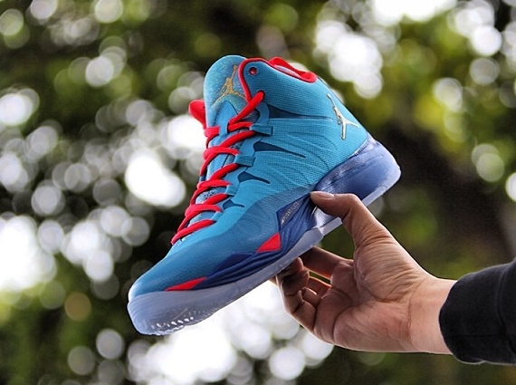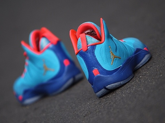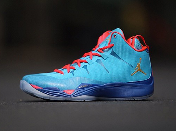 天蓝色鞋身搭配红色内衬/鞋带/鞋提,鞋头/鞋舌/内靴位置附有细微裂纹装饰,金色点缀于鞋身Jumpman logo。此款全新Jordan Super.Fly 2是Jordan Brand为Blake Griffin打造的2014年全明星赛配色。