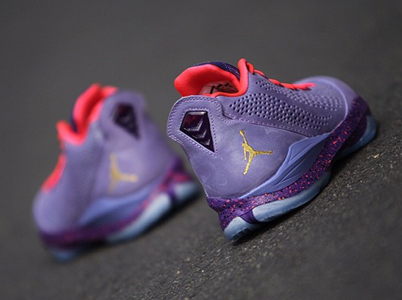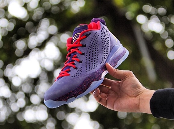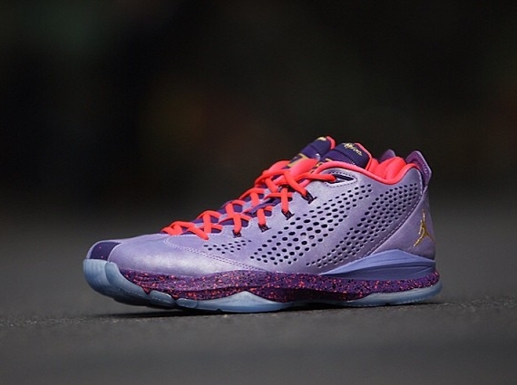 眼前这款全新Jordan CP3.VII是Jordan Brand为Chris Paul打造的2014年全明星赛配色版本,紫色作为鞋身主色凋,中底附有泼墨设计,细节则配上今年全明星系列标志性的红色以及金色点缀。