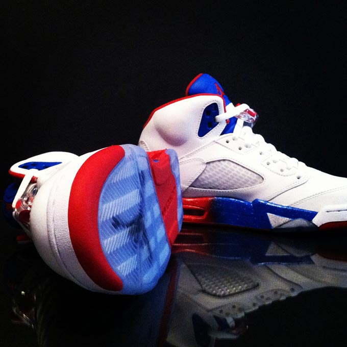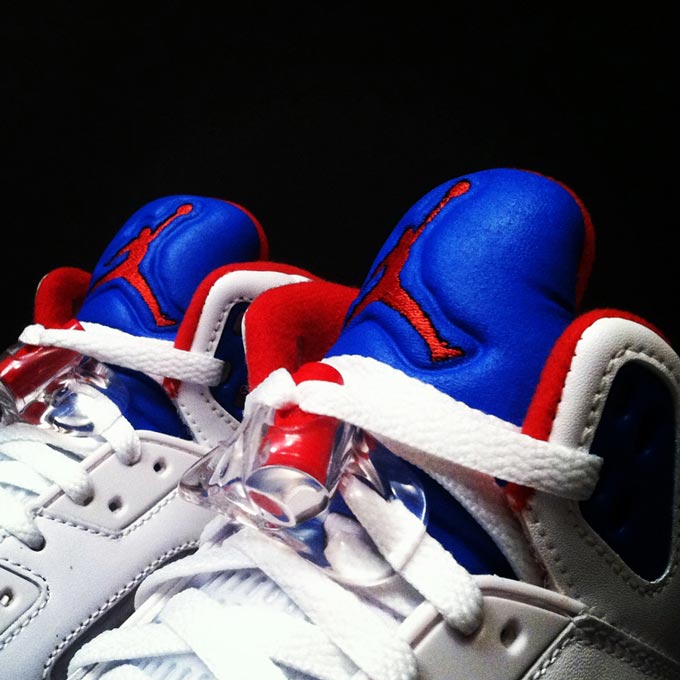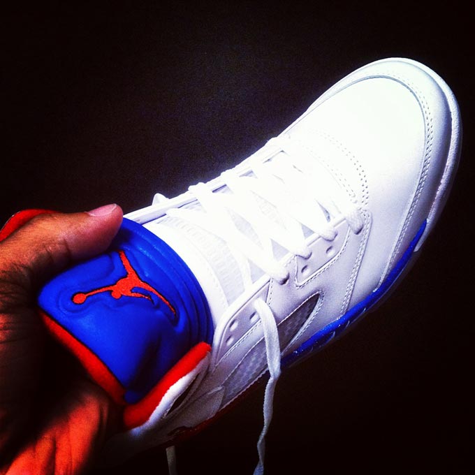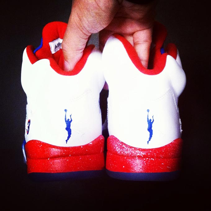 去年曝光过的一款 Air Jordan 5 "CP3" PE 最终没有如之前预料的一样市售,难免令人感到一丝遗憾。因此,日前球鞋定制方 Sole on Canvas 便自己动手打造了一款 Air Jordan 5 “CP3 Edition” 。这款定制作品以 Air Jordan 5 “Fire Red” 为蓝本出发,注入了多处的蓝色细节,以此与快船配色相呼应,设计者还别出心裁地在鞋款后跟处加载上了一个原创的保罗抛投动作 Logo。