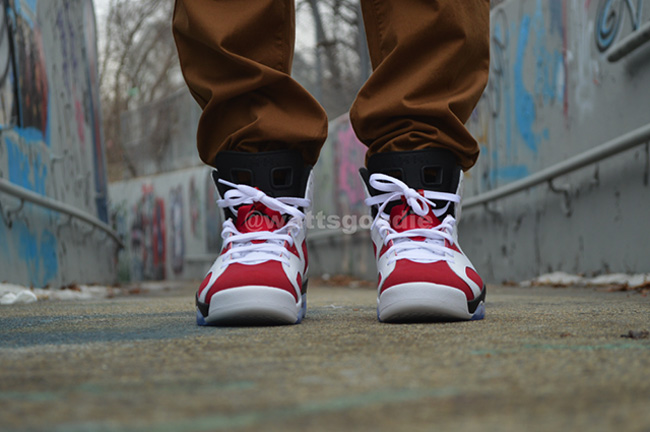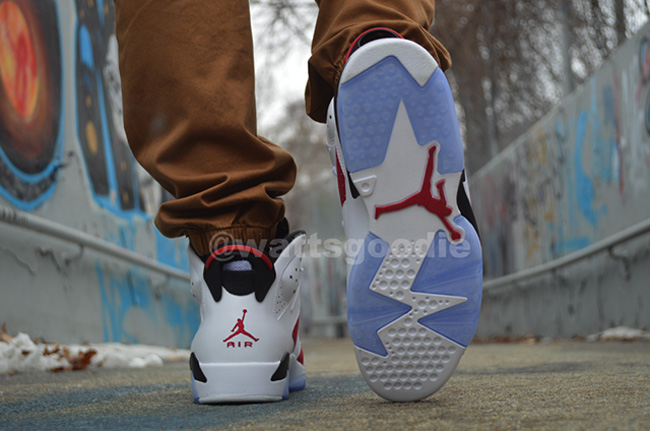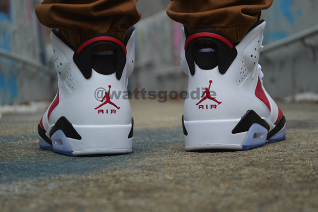 带来更多胭脂红配色 Air Jordan 6 "Carmine" 上脚实拍效果图。 鞋身采用白色和胭脂红色拼接而成,黑色的中底,搭载蓝色水晶大底,整体效果十分抢眼。 将于 5 月 24 日正式发售,GS 女款也将同时上市。 货号:384664-160 发售日期:5 月 24 日 相关信息: 【视频】Air Jordan 6 "Carmine" 胭脂红实物展示 Air Jordan 6 "Carmine" 胭脂红配色高清图赏 胭脂红 Air Jordan 6 "Carmine" 上脚实拍