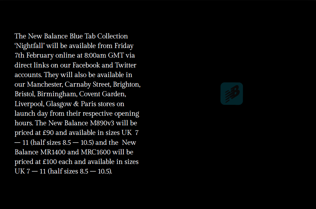 New Balance近日携手英国著名鞋店Size?推出全新2014春夏季“Blue Tab”系列鞋款,该系列由M890BN3、MR1400BN及MRC1600N三双鞋款构成。鞋款均采用黑色鞋身配以白色大底,并辅以3M细节打造而成,极为简约。据悉该系列鞋款将于2月7日正式上市。