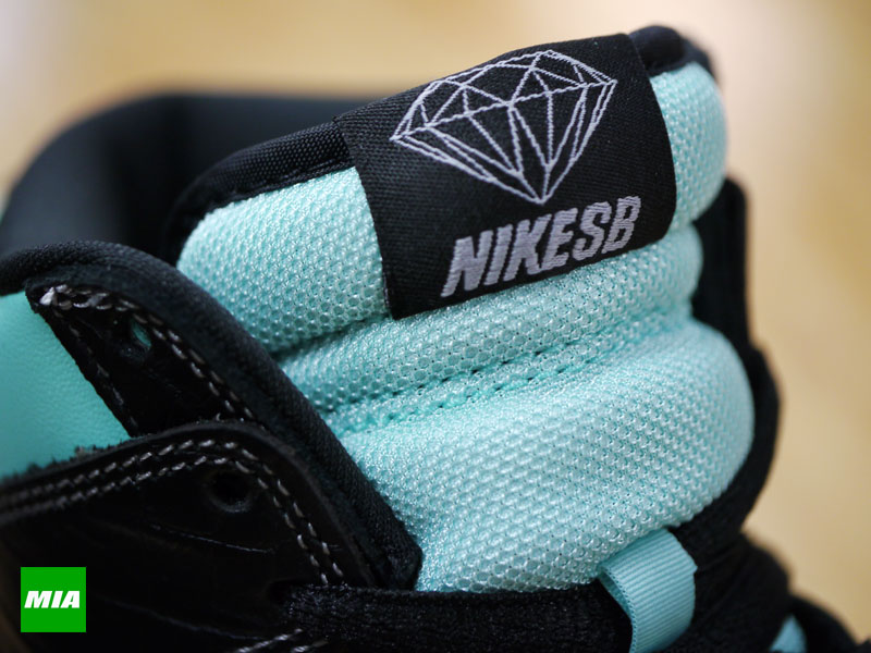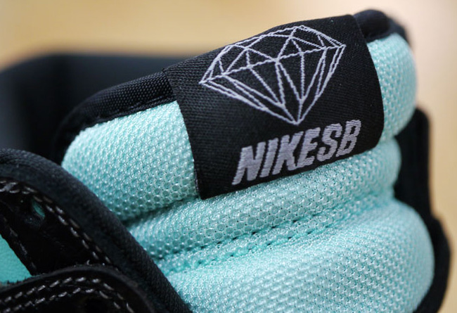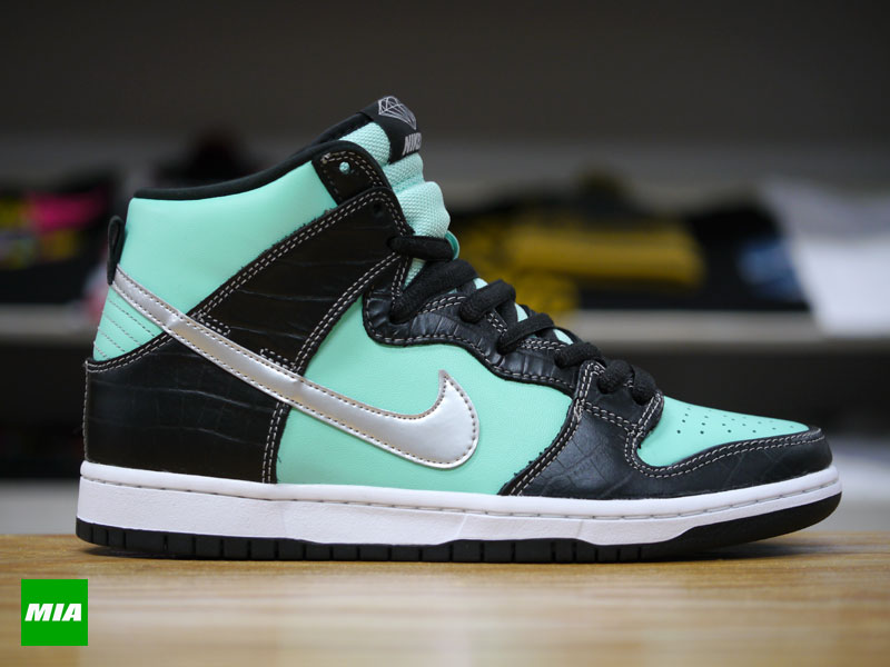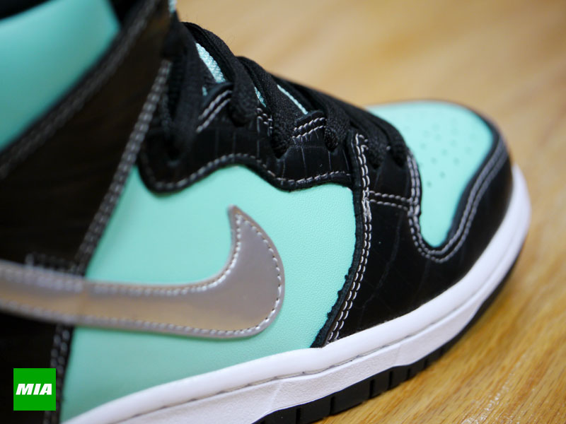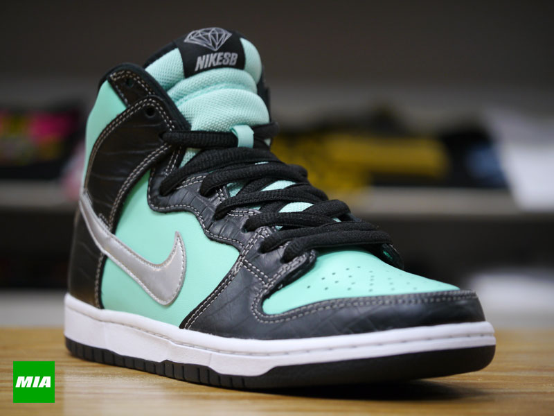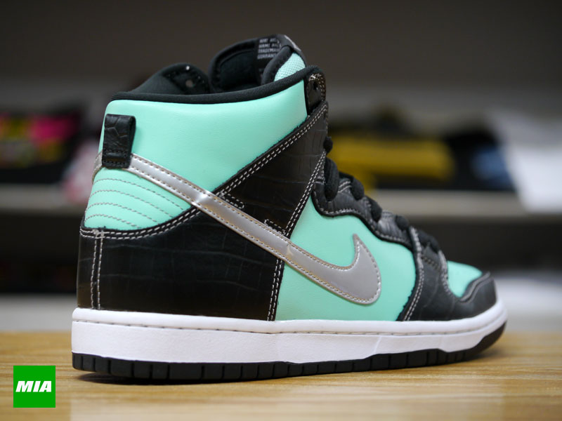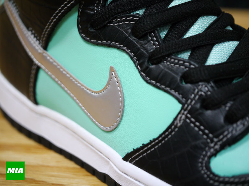 Diamond Supply Co. x Nike SB Dunk Hi “Tiffany”鞋身由靓丽的”Tiffany“色调辅以黑色鳄鱼皮打造而成,搭配白色中底与银色Swoosh。据悉此鞋款将于2月8日正式上市,售价:999RMB,货号:653599-400。